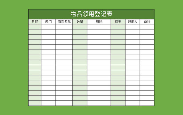 包站长提供绿色简洁风物品领用登记表EXCEL模板免费下载,作品有版权,可商用,文字图片等主体内容皆可修改,更多关于办公用品登记表下载,就来包站长。